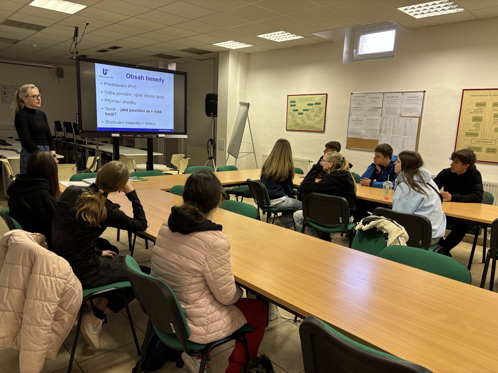 Poté jsme se přesunuli na Úřad práce Znojmo, kde nás čekala beseda zaměřená na další studijní směřování po absolvování základní školy. Žáci se dozvěděli spoustu informací důležitých pro jejich rozhodování o výběru střední školy, které je čeká v příštím školním roce. Pozornost byla věnována také aktuální nabídce oborů a požadavkům na přijetí. Dozvěděli se základní informace o středních školách na Znojemsku, což jim pomohlo lépe se zorientovat v místní nabídce. Beseda byla obohacena o konkrétní příklady z praxe, které žákům přiblížily reálné možnosti uplatnění.